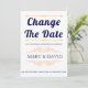 Vintage elementos e marinho de casamento com tipografia azul e pêssego Altere o anúncio de adiamento da data. Este elegante design de casamento exibe o texto "Alterar a Data" em negrito marinho, a tipografia azul e os elementos de vintage que formam quadros para o texto. A parte traseira apresenta a foto do casal.