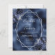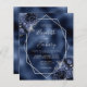 Este elegante convite de casamento moderno apresenta uma estrutura geométrica prateada decorada com buquês florais marinho azul e prateado num fundo de folha azul marinho. O texto personalizável combina a escrita manual imétrica de cinzas prateadas, a placa de cobre e as fontes itálicas. O verso é azul marinho sólido.