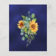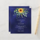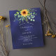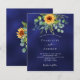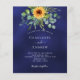 Um fundo azul marinho decorado com girassóis, eucalipto verde. A cor azul é irregular. Personalize e adicione seus nomes e detalhes da festa.