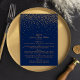 A coleção de casamento de confete de ouro azul e marinho é perfeita para qualquer casal planejando uma celebração romântica de casamento. O design apresenta um fundo azul marinho chic com um confete dourado glam que é verdadeiramente espantoso e perfeito para qualquer evento especial. O texto incorpora a mesma cor dourada do design e pode ser facilmente personalizado para a sua ocasião de rico. Itens correspondentes podem ser encontrados abaixo..
