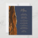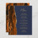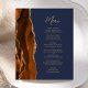 A borda esquerda deste elegante cardápio moderno de casamento mostra uma cor de água laranja queimada, aparada com uma falsa brilha de ouro. O texto personalizável combina um script dourado, fontes copperplate e itálico em um fundo azul marinho escuro. O verso apresenta uma design de cor laranja queimada e dourada.