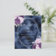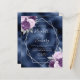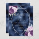 Este elegante convite de casamento moderno apresenta uma estrutura geométrica prateada decorada com buquês florais lilás, roxas e prateadas num fundo azul marinho. O texto personalizável combina a escrita manual imétrica de cinzas prateadas, a placa de cobre e as fontes itálicas.