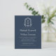 Este elegante design de convite de casamento inspirado em vintage apresenta um par de iniciais monográficas brancas em letra serif aberta acima e abaixo de uma linha divisória e rodeadas por uma crista botânica de arte de linha num fundo azul marinho. A parte traseira da placa é azul marinho estável.