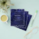 Note que este programa/menu está em papel folheto e muito fino. Para programas/menus mais espessos (mesmo design) visite nossa loja. Um clássico programa de casamento e cardápio. Um fundo azul marinho. A cor azul é irregular. Texto branco. Decorado com falso brilho prateado, faíscas. Personalize e adicione seu nome, data e programa e menu.