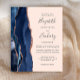 A borda esquerda deste elegante convite de casamento moderno apresenta um marinho azul de aquarela agate bordado com falso brilho rosa de ouro. O texto personalizável combina o script de escrita manual de cinzas de carvão com fontes em copperplate e itálico em um plano de fundo de blush. O verso apresenta um design marinho de agate azul e rosa dourado correspondente.