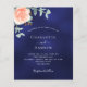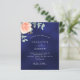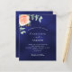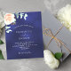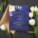 fundo azul marinho, a cor azul é irregular. Decorados com ouro-rosa e folhas de eucalipto cor-de-rosa-esbranquiçada, flores de rosa e cor-de-rosa-esbranquiçada, galhos, verde e borras de ouro. Personalize e adicione seus nomes e detalhes do casamento. 1 folha = 1 convite impresso de borda a borda.
