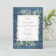 Apresentando delicadas folhas de aquarela em um fundo de painéis de madeira azul rústico, este convite de casamento botânico pode ser personalizado com sua informação especial sobre o dia do casamento. Projetado por Thisnotme©