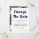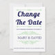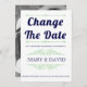 Vintage elementos e marinho azul e casamento da tipografia verde-menta Mude o anúncio de adiamento da data. Este elegante design de casamento exibe o texto "Alterar a Data" em negrito marinho, a tipografia azul e os elementos de vintage que formam quadros para o texto. A parte traseira apresenta a foto do casal.