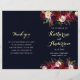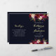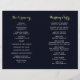Programa de casamento estilo boêmico com ilustração aquosa de peões e rosas de burgundy, vermelha e rosa, com destaque de penas sobre fundo azul marinho. NOTA: Você precisará dobrá-los ao meio quando eles chegarem.