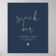 Este sinal de bar de snack apresenta uma fonte esmaecida escrita à mão e um design moderno minimalista com uma combinação moderna de cor azul e dourada do marinho. Altere facilmente as cores da fonte e a cor do plano de fundo para corresponder ao estilo do evento. Par com itens adicionais da coleção CAITLIN para uma aparência coesa.