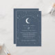 Uma lua celeste e um convite de casamento estrelado com temas estelares com um fundo de cinza e um texto branco com elementos. Personalize a cor do padrão estelar, fundo, preenchimento de arco e elemento lua!