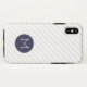 Capas de iphone de monograma listrada. Monograma clássico de texto branco fino dentro de uma borda azul redonda de marinho em faixas finas diagonais em azul marinho.