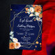 Banheira laranja e branca, eucalipto verde marinho azul de fundo ouro geométrico convite de casamento floral com código QR RSVP no verso.
