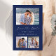 Esta simples e minimalista placa Save the Date apresenta uma fotografia horizontal na parte superior e duas fotos quadradas na parte inferior. No meio, as palavras "Salvar a Data" aparecem no elegante guião branco, seguido dos nomes do casal, da data do casamento e da cidade em sans serif em um fundo azul marinho. Adicione uma mensagem mais detalhada com informações adicionais no verso.