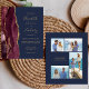 A borda esquerda deste elegante convite de casamento moderno apresenta uma cor vermelha e borrifada, com uma falsa brilha de ouro. O texto personalizável combina manuscrito dourado, fontes em copperplate e itálico em um fundo azul marinho. O verso fornece espaços para 4 fotos (1 quadrado, 2 horizontais, 1 vertical longo) e espaço para o seu site de casamento URL ou outras informações.