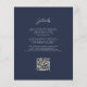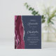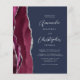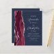 A borda esquerda deste elegante e moderno convite de casamento mostra uma cor vermelha e entrelaçada de água com uma falsa brilha prateada. O texto personalizável combina o script de cinza prateada e as fontes sans serif em um fundo azul marinho. O verso fornece espaço para detalhes do casamento em um fundo azul de marinho sólido, junto com um código QR que os convidados podem digitalizar para visitar seu site e RSVP, o que economiza o custo de imprimir e enviar cartões RSVP separados.