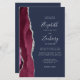 A borda esquerda deste elegante convite de casamento moderno apresenta uma cor d'água borrifada com borda cortada com cintilação falsa de prata. O texto personalizável combina a escrita manual de cinzas prateadas, fontes copperplate e itálico em um fundo azul marinho. Adicione mais detalhes no verso, juntamente com um código QR para ajudar seus convidados a visitar seu site de casamento.