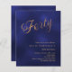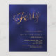 Um convite moderno e na moda para uma festa aniversário de 40 anos. Um fundo azul marinho, incolor e com a palavra Quarenta escrita com letras elegantes e grandes em dourado falso. Personalize e adicione um nome e detalhes da parte. 1 folha = 1 convite impresso de borda a borda.
