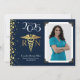 Celebrar o novo formando da escola de enfermagem com este anúncio de graduação de ouro e marinho azul sobre caduceus! Elegante com uma borda de fotos vintage e sotaques de confete dourados! Perfeito para quem se formar como enfermeira com seu solteiro de ciência em enfermagem!