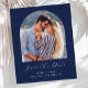 Este simples e minimalista Cartão Salvar a Data apresenta um boho de fotos acima das palavras "Salvar a Data" em um elegante roteiro branco, seguido pelos nomes do casal, data do casamento e cidade em sans serif em um fundo azul marinho. Adicione uma mensagem mais detalhada com informações adicionais sobre o contrário.
