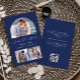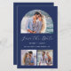 Esta simples e minimalista placa Save the Date apresenta uma fotografia horizontal em forma de arco na parte superior e duas fotos quadradas na parte inferior. No meio, as palavras "Salvar a Data" aparecem no elegante guião branco, seguido dos nomes do casal, da data do casamento e da cidade em sans serif em um fundo azul marinho. Adicione uma mensagem mais detalhada com informações adicionais na parte traseira, juntamente com um código QR para ajudar seus convidados a visitar o site do seu casamento.