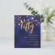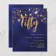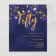 Um convite moderno e na moda para uma 50ª festa de aniversário para ele e para ela. Decorado com estrelas ouros. Fundo azul marinho e a palavra 50 escrita com letras douradas falsas grandes. A cor azul é irregular. Personalize e adicione um nome e detalhes da parte. 1 folha = 1 convite impresso de borda a borda.