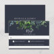 Arranjo de folhagem da floresta rustica, cartões RSVP de casamento, com fundo azul de cor marinho sólida e nota de alergia de comida.