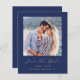 Este simples e minimalista Cartão Salvar a Data contém uma foto quadrada acima das palavras "Salvar a Data" em um elegante roteiro de escrita manual de cor dourada, seguido dos nomes do casal, da data do casamento e da cidade em sans serif em um fundo azul marinho. Adicione uma mensagem mais detalhada com informações adicionais sobre o contrário.