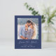 Este simples e minimalista Cartão Salvar a Data contém uma foto quadrada acima das palavras "Salvar a Data" no elegante guião branco, seguido pelos nomes do casal, data do casamento e cidade em sans serif em um fundo azul marinho. Adicione uma mensagem mais detalhada com informações adicionais sobre o contrário.
