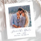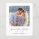 Este simples e minimalista Cartão Salvar a Data contém uma foto quadrada acima das palavras "Salvar a Data" no elegante roteiro azul de manuscrito, seguido pelos nomes dos casais, data do casamento e cidade em sans serif em um fundo branco. Adicione uma mensagem mais detalhada com informações adicionais sobre o contrário.