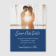 Um casamento Salve o cartão magnético Date com um fundo azul marinho e uma letra branca. Adicione sua foto, seus nomes, data do casamento e cidade/estado. Quatro campos podem ser personalizados para serem seus.