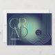 Uma fonte corajosa e decorativa imediatamente pega seu olho e define o tom para este convite de formatura único em uma maravilhosa paleta de cores retrógradas de azul-claro-marinho a azul-escuro. Um padrão surpreendente de curvas de alternância dá ao fundo uma aparência moderna de Art Deco. Um modelo permite personalizar facilmente os detalhes do evento. Procure ID906 para ver outras opções de cor para este design.