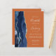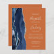A borda esquerda deste elegante convite de casamento moderno apresenta um marinho azul de aquarela agata bordada com falso brilho prateado. O texto personalizável combina manuscritos, placas de impressão e fontes itálicas em cinzas prateadas leves em um fundo laranja. O verso fornece espaço para detalhes do casamento em um fundo laranja sólido, junto com um código QR que os convidados podem digitalizar para visitar seu site e RSVP, o que economiza o custo de imprimir e enviar RSVP separados