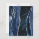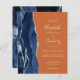 A borda esquerda deste elegante convite de casamento moderno apresenta um marinho azul de aquarela agata bordada com falso brilho prateado. O texto personalizável combina manuscrito, fontes copperplate e itálico em cinzas prateadas leves em um fundo laranja queimado. O verso apresenta um design azul marinho e agate prateado correspondentes.