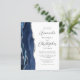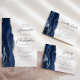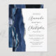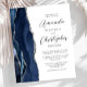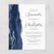 A borda esquerda deste elegante convite de casamento moderno apresenta um marinho azul de aquarela agata bordada com falso brilho prateado. O texto personalizável combina o script de cinza de carvão e as fontes sans serif em um fundo branco. O verso apresenta um design azul marinho e agate prateado correspondentes.