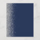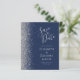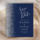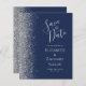 A borda esquerda deste elegante casamento moderno salve o cartão de data apresenta uma borda cintilante. O texto personalizável combina a escrita manual de cinzas prateadas e as fontes em um fundo azul marinho. O verso apresenta um design marinho azul e prateado correspondente.