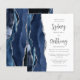 A borda esquerda deste elegante convite de casamento moderno apresenta um marinho azul de aquarela agata bordada com falso brilho prateado. O texto personalizável combina o script de caligrafia de cinza de carvão e sans serif em um fundo branco. O verso apresenta um design azul marinho e agate prateado correspondentes.