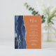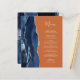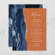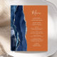 A borda esquerda deste elegante cardápio moderno de casamento apresenta um marinho azul de aquarela agata bordada com falso brilho prateado. O texto personalizável combina a escrita manual e as fontes de impressão em cinzas prateadas em um fundo laranja queimado. O verso apresenta um design azul marinho e agate prateado correspondentes.