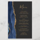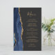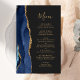 A borda esquerda deste elegante cardápio moderno de casamento apresenta uma marinho azul de aquarela agata bordada com falso brilho dourado. O texto personalizável combina o script de escrita manual dourado e as fontes de impressão em um plano de fundo off-black. O verso apresenta um design azul-marinho e um agate-ouro correspondentes.