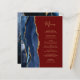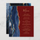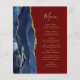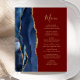 A borda esquerda deste elegante cardápio moderno de casamento apresenta uma marinho azul de aquarela agata bordada com falso brilho dourado. O texto personalizável combina um script de escrita manuscrita dourada e fontes de impressão em fundo vermelho burgundy. O verso apresenta um design azul-marinho e um agate-ouro correspondentes.