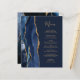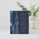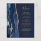 A borda esquerda deste elegante cardápio moderno de casamento apresenta uma marinho azul de aquarela agata bordada com falso brilho dourado. O texto personalizável combina o script de manuscrito dourado e as fontes em um fundo azul marinho. O verso apresenta um design azul-marinho e um agate-ouro correspondentes.