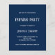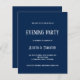 Marinho de Texto Branco do Orçamento Convite de festas Azul da Noite. Totalmente personalizável. Um design tipográfico moderno em um cartão de ponto-e-vírgula de preço de 4,5 x 5,6 pol (semelhante à espessura de um cartão postal) menor para convidar seus convidados noturnos para o seu casamento. As cores podem ser alteradas se necessário por meio de personalização adicional.