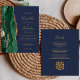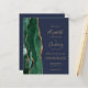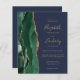 A borda esquerda deste elegante convite de casamento moderno apresenta uma esmeralda verde aquarela agate borda com falsa brilho dourado. O texto personalizável combina manuscrito dourado, fontes em copperplate e itálico em um fundo azul marinho. O verso fornece espaço para detalhes do casamento em um fundo azul de marinho sólido, junto com um código QR que os convidados podem digitalizar para visitar seu site e RSVP, o que economiza o custo de imprimir e enviar cartões RSVP separados.