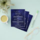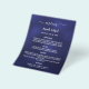Por favor, note que este convite está no papel de folheto e é muito fino. Os envelopes não estão incluídos. Para convites mais espessos (mesmo design) visite nossa loja. Um clássico cardápio de casamento. Um fundo azul marinho. A cor azul é irregular. Texto branco. Personalize e adicione seu nome, data e menu. Você pode adicionar mais texto, fotos no verso.