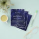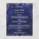 Por favor, note que este menu está no papel folheto e muito fino. Para menus mais espessos (mesmo design) visite nossa loja. Um clássico cardápio de casamento. Um fundo azul marinho, decorado com faxes cintilantes prateados. A cor azul é irregular. Texto branco. Personalize e adicione seu nome, data e menu. Você pode adicionar mais texto, fotos no verso.