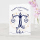 O interior do cartão de aniversário do Libra é projetado com um fundo corajoso dos azuis marinhos e uma constelação estrelado do Libra bonito da folha de ouro do falso. O cartão de aniversário é personalizado com o nome do receptor e a data de nascimento, assim como um ponto para sua própria mensagem personalizada do aniversário no interior.