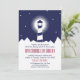 Convite de casamento náutico em azul marinho e criminoso apresentando uma ilustração de um farol à noite contra um céu estrelado.