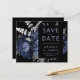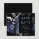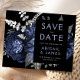 Este elegante e melancólico casamento Salve o cartão da data apresenta um buquê floral romântico e luxuoso em azul marinho com folha de cor prateada e folhagem brilhante num fundo preto. Personalize a cinza prateada e o texto azul empoeirado em fontes na moda num retângulo preto, e adicione o URL do seu site de casamento ao fundo preto sólido.