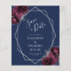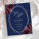 Este elegante casamento moderno salva o cartão de data apresenta um quadro geométrico prateado decorado com buquês florais de burgundy e prata num fundo azul marinho. O texto personalizável combina a escrita manual imétrica de cinzas prateadas, a placa de cobre e as fontes itálicas.