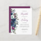 A borda esquerda deste convite romântico de casamento apresenta um buquê floral de cor d'água de flores roxas e marinhos azuis e verde. O texto personalizável combina manuscrito, copperplate e fontes itálicas em cinzas de carvão em um fundo branco. O reverso é uma ameixa sólida coordenadora.